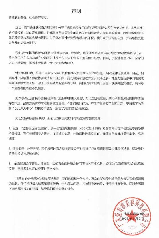 洗脸熊在声明中表示,企业第一时间组织专项团队跟进处理此事,经核查,此次涉及闭店且未能妥善处理退款事宜的门店,系个别门店在未与总部充分沟通并违反合作协议的情况下擅自停业所致。目前,洗脸熊全国2600余家门店均正常运营,服务未受影响,请广大消费者放心。
