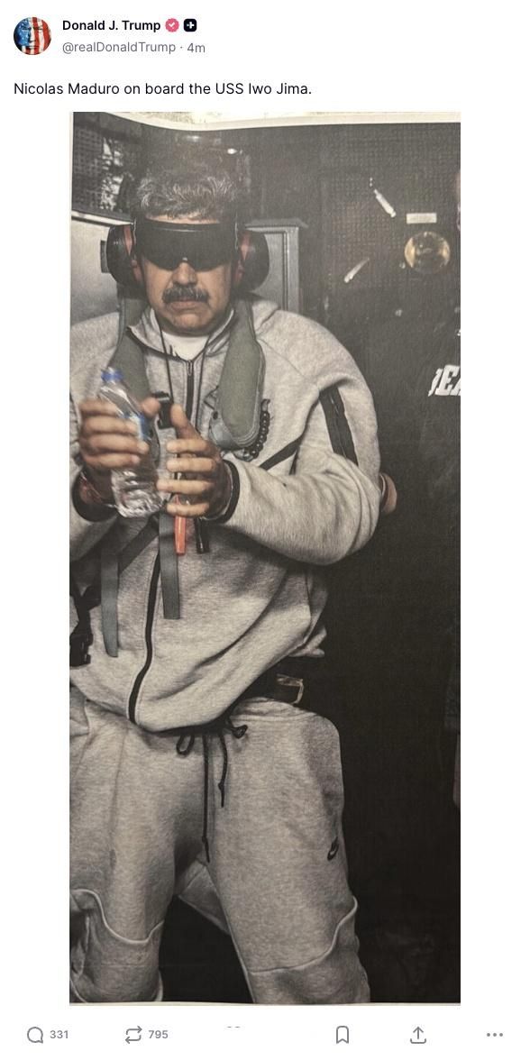 美国总统特朗普3日在社交媒体上发布委内瑞拉总统马杜罗在美国军舰上戴手铐、双眼被蒙住的照片。特朗普称,马杜罗在美军“硫磺岛”号军舰内。(新华社)