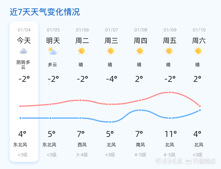 今天是2026年1月4日,星期日,农历十一月十六。济南市今日天气为阴转多云,气温在-2℃至4℃之间,东风1级,空气湿度为57%,PM2.5指数为118,空气质量为良。全市各区天气情况基本一致,整体较为平稳。
