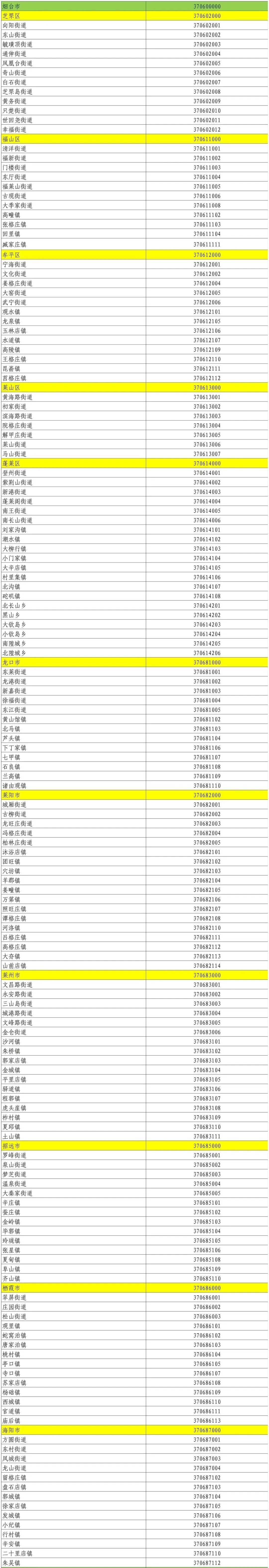烟台最新的行政区划代码吧