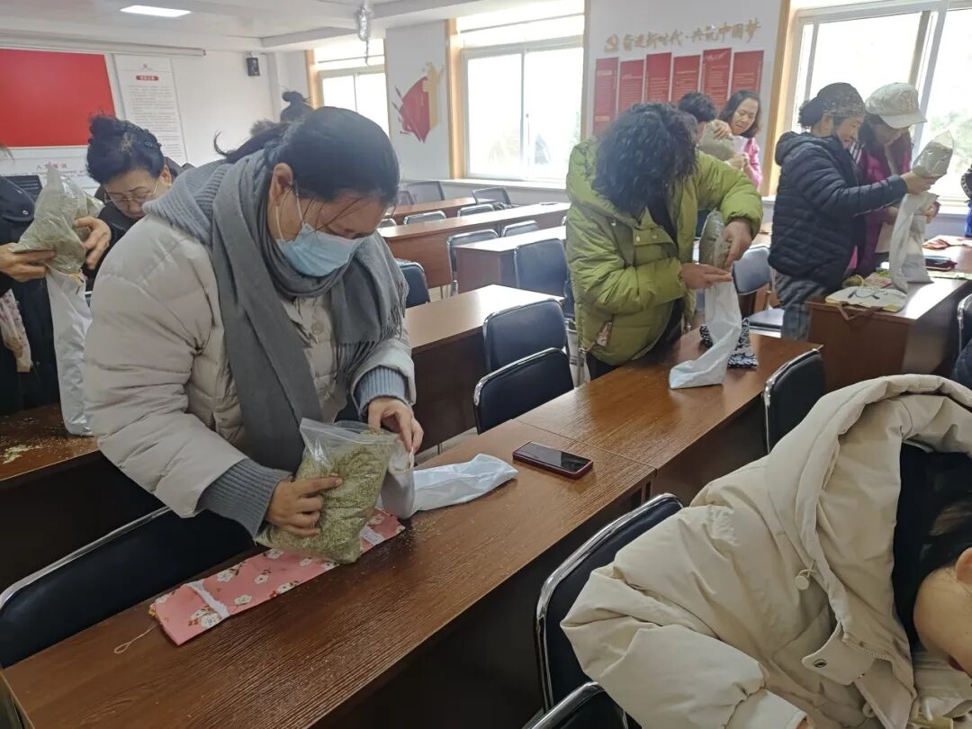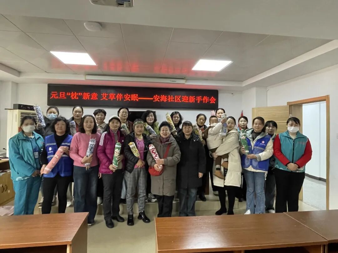 以传统手工制作为载体,联合专业医疗机构开展“元旦‘枕’新意,艾草伴安眠”迎新手作会活动。活动开始后,专业医护人员为居民详细讲解艾草的养生功效及艾草枕的助眠原理,随后演示艾草枕制作步骤。居民们自发结组、互相配合,完成艾草枕芯填充与枕套缝制,制作出兼具舒适、美观和养生功能的艾草枕。