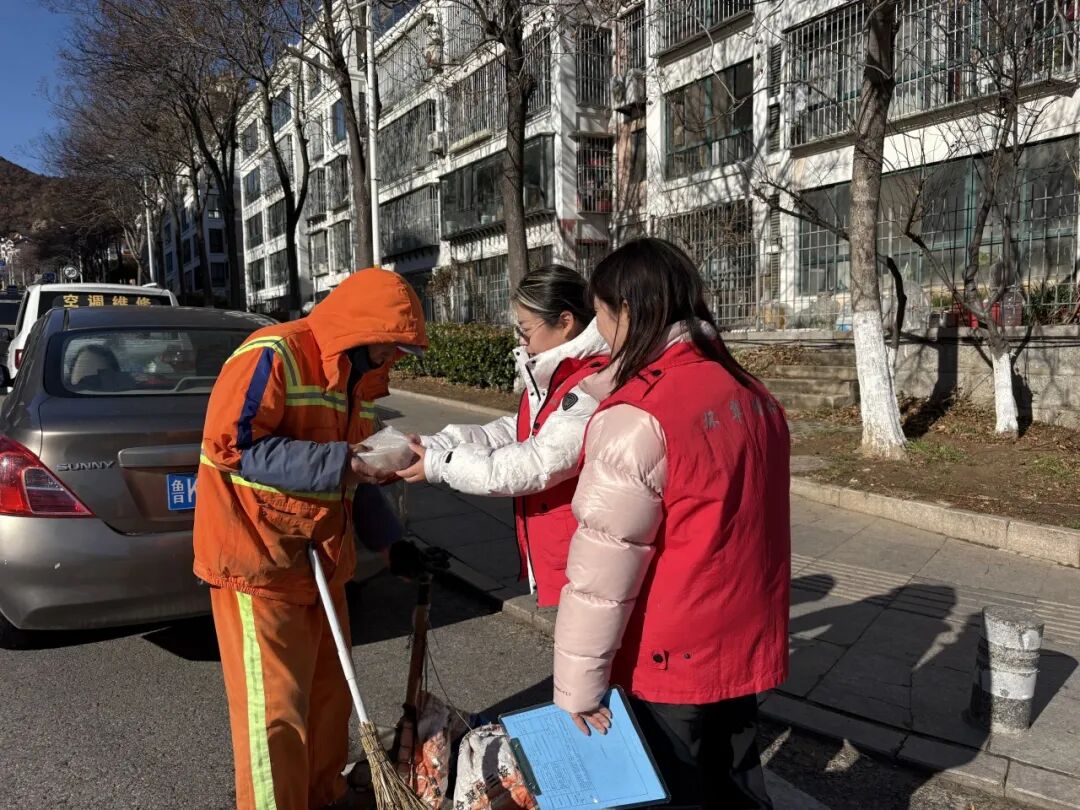 饺子制作完成后,志愿者带着热腾腾的饺子,分别前往辖区残疾人家中和环卫工人工作岗位。在残疾人家中,工作人员详细询问身体状况和生活情况,叮嘱注意保暖、保重身体;在辖区路边,志愿者向环卫工人送上饺子,感谢他们为维护社区环境整洁的辛勤付出。