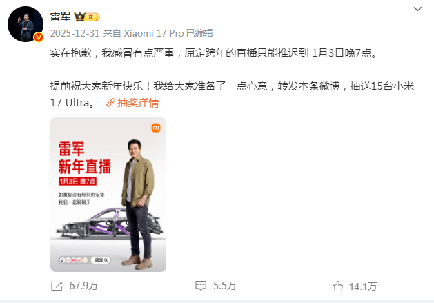 12月31日雷军发文称:“实在抱歉,我感冒有点严重,原定跨年的直播只能推迟到1月3日晚7点。”