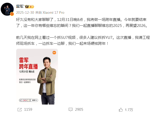 2025年12月30日,小米创办人、董事长兼CEO雷军宣布,好久没有和大家聊聊了,12月31日晚8点,我将做一场跨年直播。今年就要结束了,这一年你有哪些难忘的瞬间?我们一起直播聊聊难忘的2025,再展望2026。