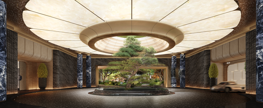 项目超酒店式落客大堂,通过一个环岛式的落客区域,重新定义了空间的结构概念。这种设计不仅重塑了观展式的归家动线,还巧妙地呈现了一种高端居住体验的初步印象。