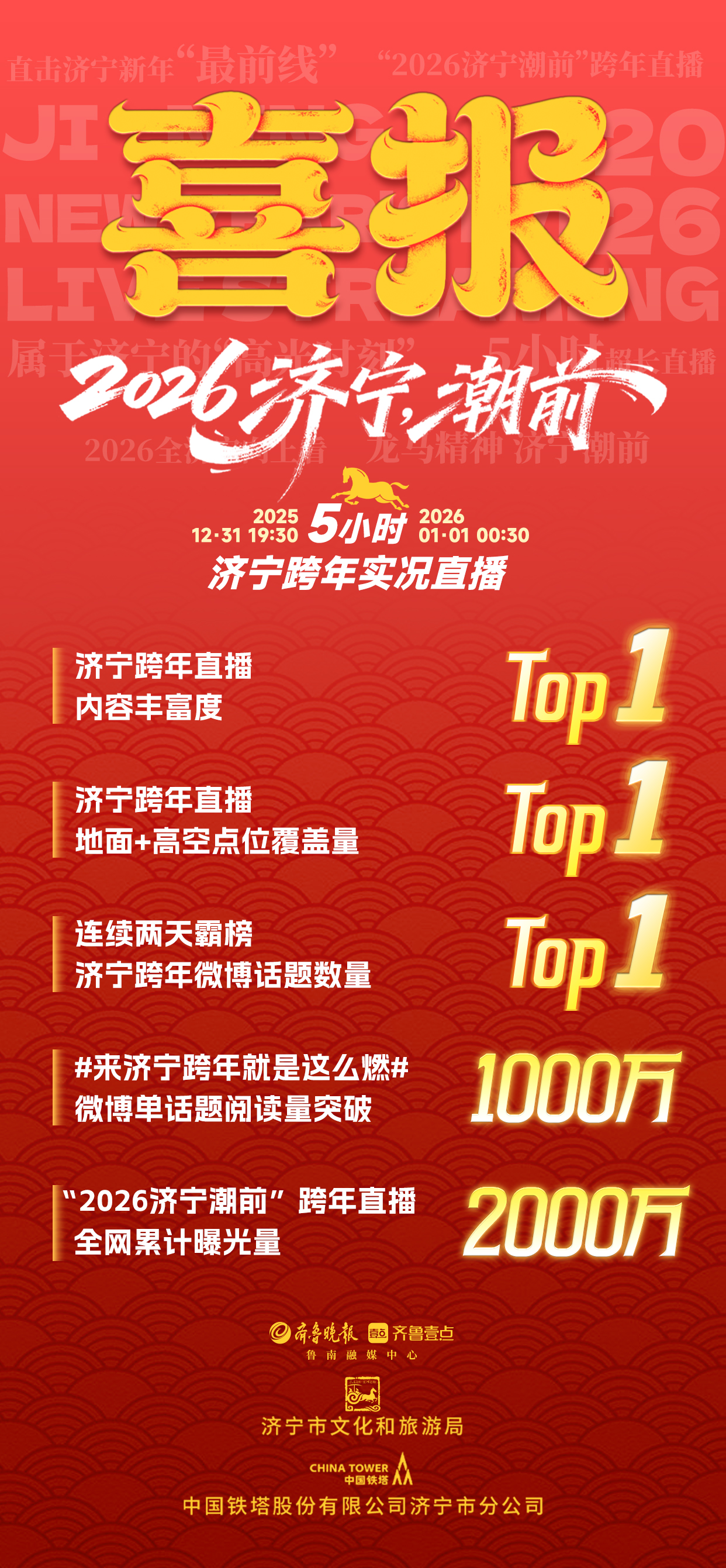 2026年1月1日,由齐鲁晚报鲁南融媒中心联合济宁市文化和旅游局、中国铁塔股份有限公司济宁市分公司主办的"2026济宁潮前"大型跨年实况直播活动圆满收官。作为济宁市"十五五规划"开局之年的首场城市级盛事,活动以5小时不间断直播、十余个点位立体联动强势霸榜,8条话题登上同城热搜前十,5条冲进前三,主话题#来济宁跨年就是这么燃#阅读量突破千万,全网累计曝光量超2000万,成功塑造了"文化济宁"年轻化、数字化的城市新名片。