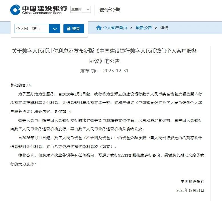 建设银行也表示,为了更好地为您服务,自2026年1月1日起,中国建设银行将为您开立的建设银行数字人民币实名钱包余额按照本行活期存款挂牌利率计付利息,计结息规则与活期存款一致,并相应修订《中国建设银行数字人民币钱包个人客户服务协议》相关内容。