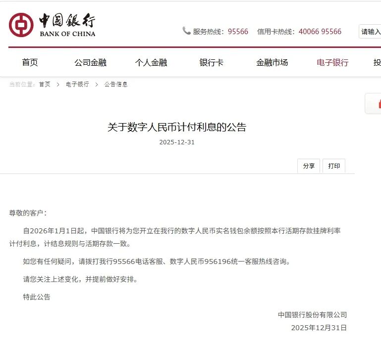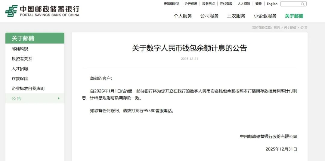 工商银行、农业银行、中国银行、邮储银行公告称,自2026年1月1日起,将为您开立在该行的数字人民币实名钱包余额按照本行活期存款挂牌利率计付利息,计结息规则与活期存款一致。