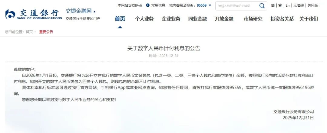交通银行称,自2026年1月1日起,交通银行将为您开立在我行的数字人民币实名钱包(包含一类、二类、三类个人钱包和单位钱包)余额,按照该行公布的活期存款挂牌利率计付利息。如您开立的数字人民币钱包为四类个人钱包,则钱包内的余额不计付利息。