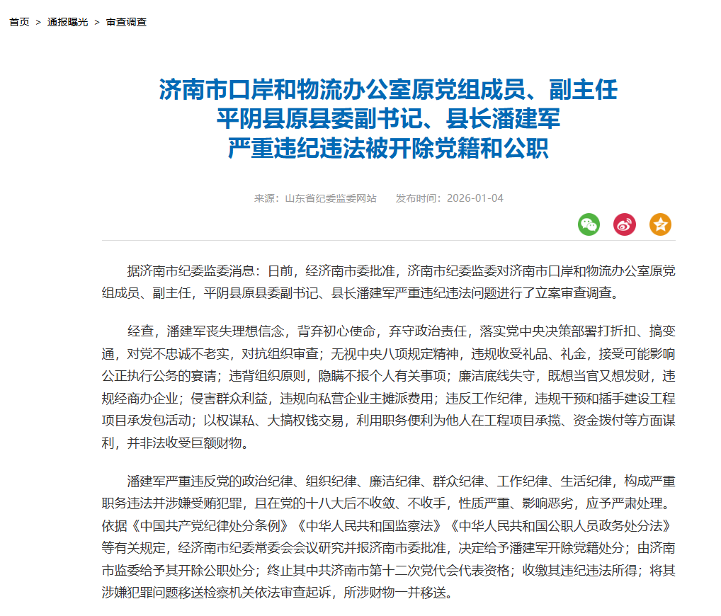 济南市口岸和物流办公室原党组成员、副主任,平阴县原县委副书记、县长潘建军严重违纪违法被“双开”