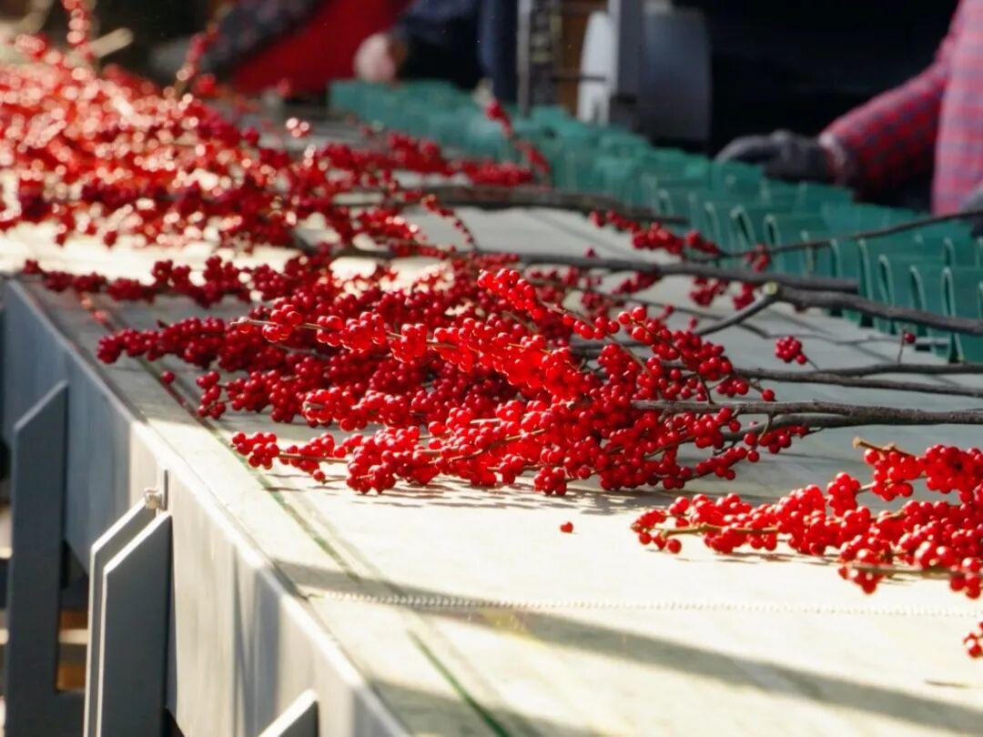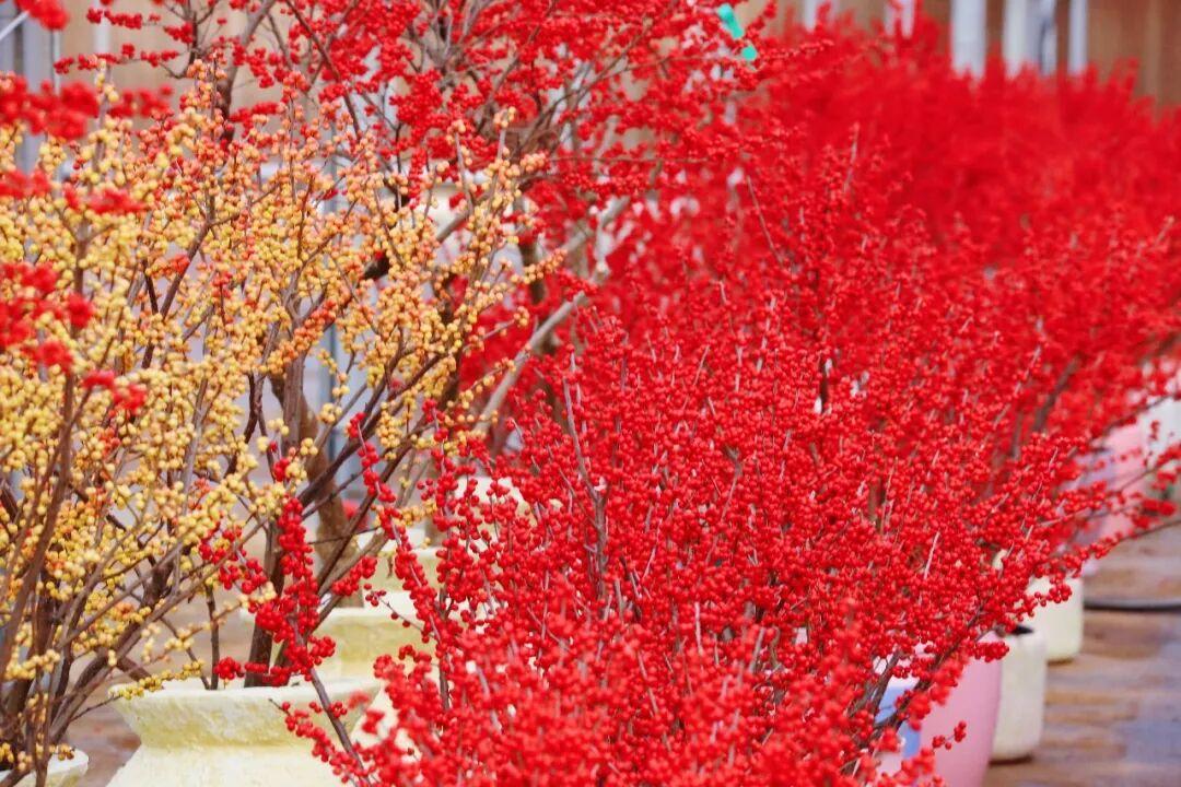 凭借“红红火火、富贵吉祥”的美好寓意和独特的观赏价值,北美冬青早已成为年宵花界的“宠儿”。其果枝在水中可保鲜一个多月,从元旦到春节,始终能留住这份红火景致。还可搭配银柳、松柏、尤加利叶等花材制成花艺作品,红果点缀其间,瞬间拉满喜庆氛围。