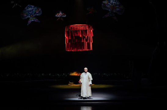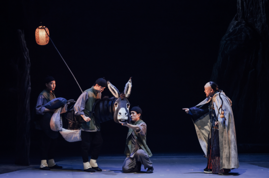 尤其值得一提的是,剧中人偶驴“懂事”的设计堪称点睛之笔。以海绵、藤条为主体材料打造的人偶,由三位演员操控,能灵活完成踢腿、打滚、嘶鸣等动作,其倔强、正直的拟人化特质,既是郑板桥性格的外化,更让廉洁主题跳出严肃说教,变得鲜活可感;人偶牛,低垂的眼眸、沉稳的神态,也与郑板桥形成呼应,让整场演出的为民情怀更具层次与温度。
