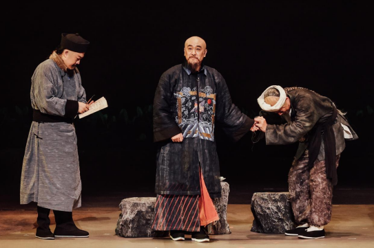 主创团队以匠心雕琢艺术,让廉洁主题在舞台上自然落地、深入人心。导演兼主演何冰凭借精湛演技,将郑板桥的文人洒脱与清官担当融为一体——蹙眉忧思灾情时的凝重、与乡绅据理力争时的坚定、辞官时“乌纱掷去不为官,囊橐萧萧两袖寒”的决绝,每一个神态、每一句台词都直击人心;舞美设计紧扣中国水墨写意风格,开场时开裂的土地布景、昏暗的色调,瞬间将观众带入潍县灾年的萧瑟氛围;莱州府衙二堂的中式窗棂、潍县粮仓的厚重大门,既还原场景特质,又暗合“为官当守正”的隐喻;郑板桥妆容以“竹之风骨”为核,清瘦的面部线条、花白的须发、略带疲惫却锐利的眼神,完美呈现其“饱经风霜却心怀天下”的形象。