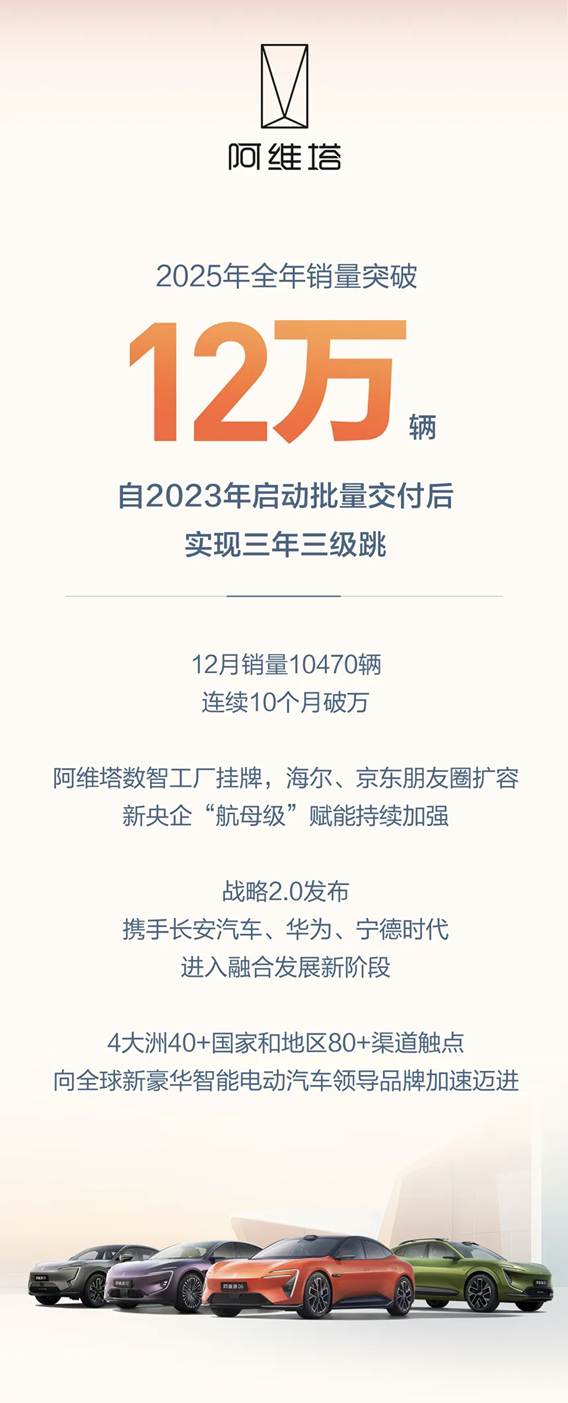 阿维塔,定位“原创、智能新豪华汽车品牌”,凭借情感智能与豪华设计,树立了高端品牌形象。通过陆续推出阿维塔07、06等新品,强化了产品矩阵。2025年全年销量突破12万辆,自2023年启动批量交付后实现三年三级跳。其中,12月销量10470辆,已连续10个月破万。面向2026年及未来,阿维塔将向全球新豪华智能电动汽车领导品牌加速迈进。