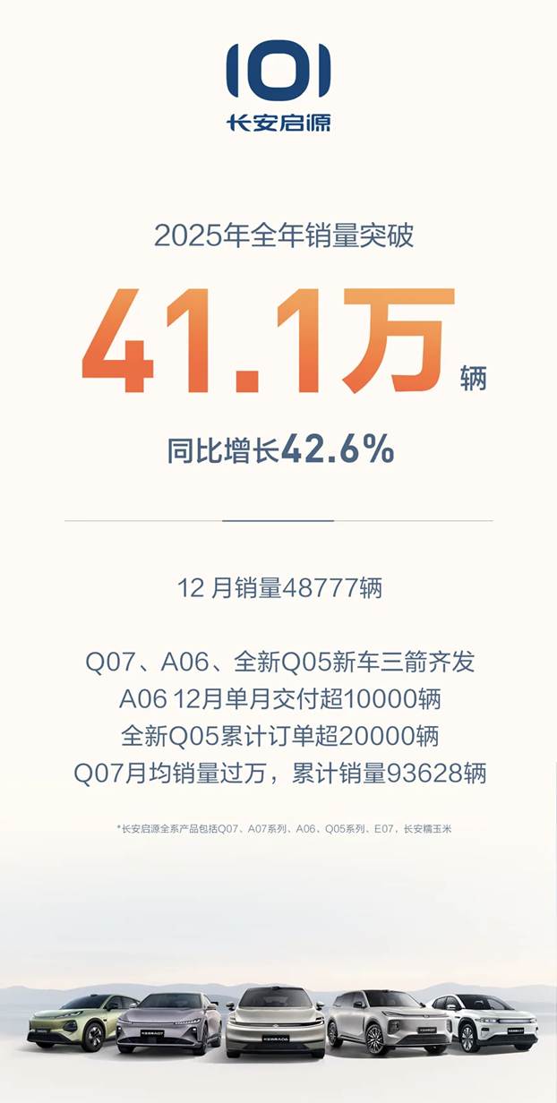 长安启源作为“智能移动生活家”,面向全球主流家庭新能源用户,提供融合多元生活场景且具有极致性价比的新一代产品。今年推出了长安启源Q07、A06、全新Q05等多款深受家庭用户欢迎的新车型,其中,A06 12月单月交付超1万辆,全新Q05累计订单超2万辆,Q07月均销量过万,累计销量93628辆,成功推动领先新能源技术普惠化。2025年全年销量突破41.1万辆,同比增长42.6%,强势崛起。