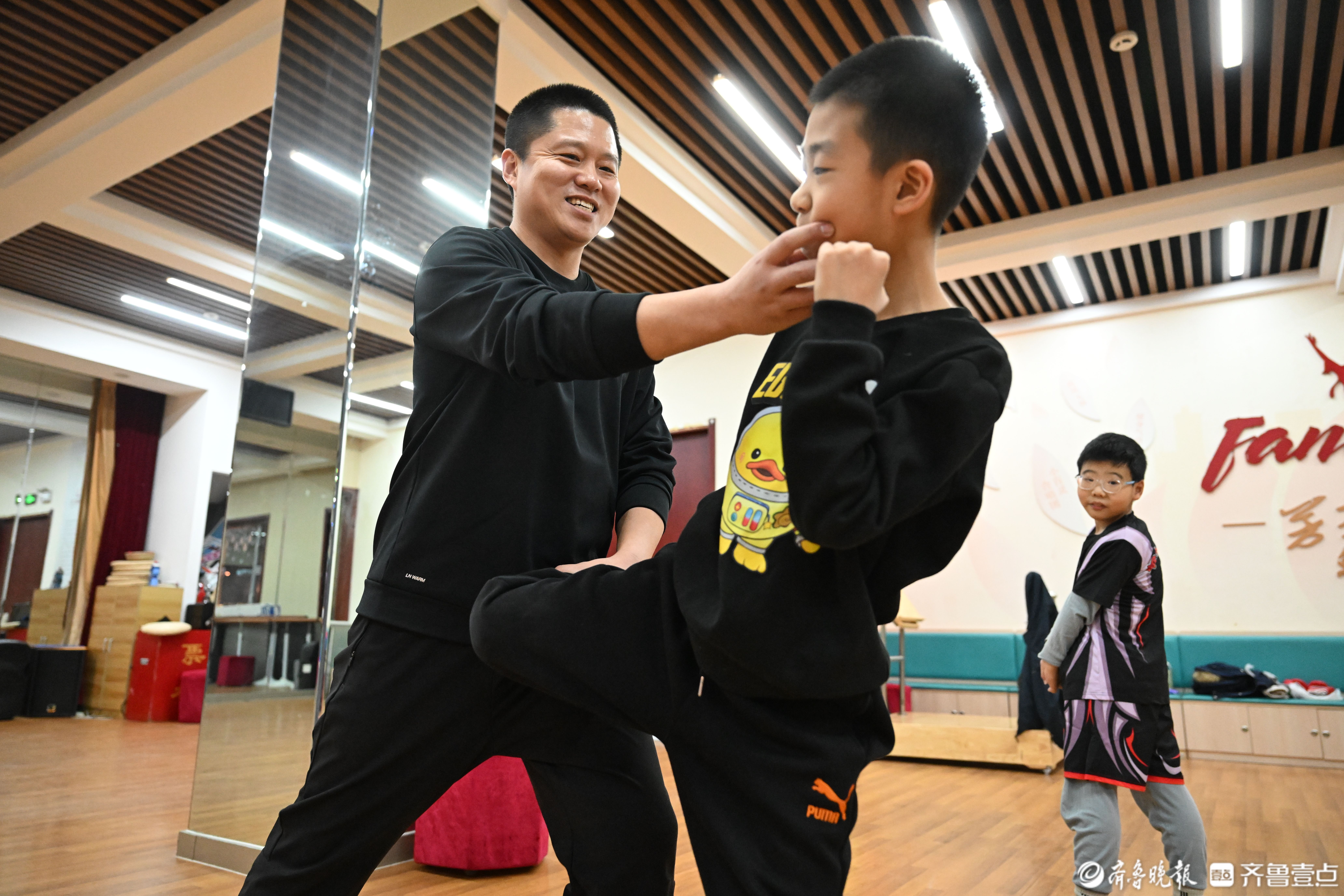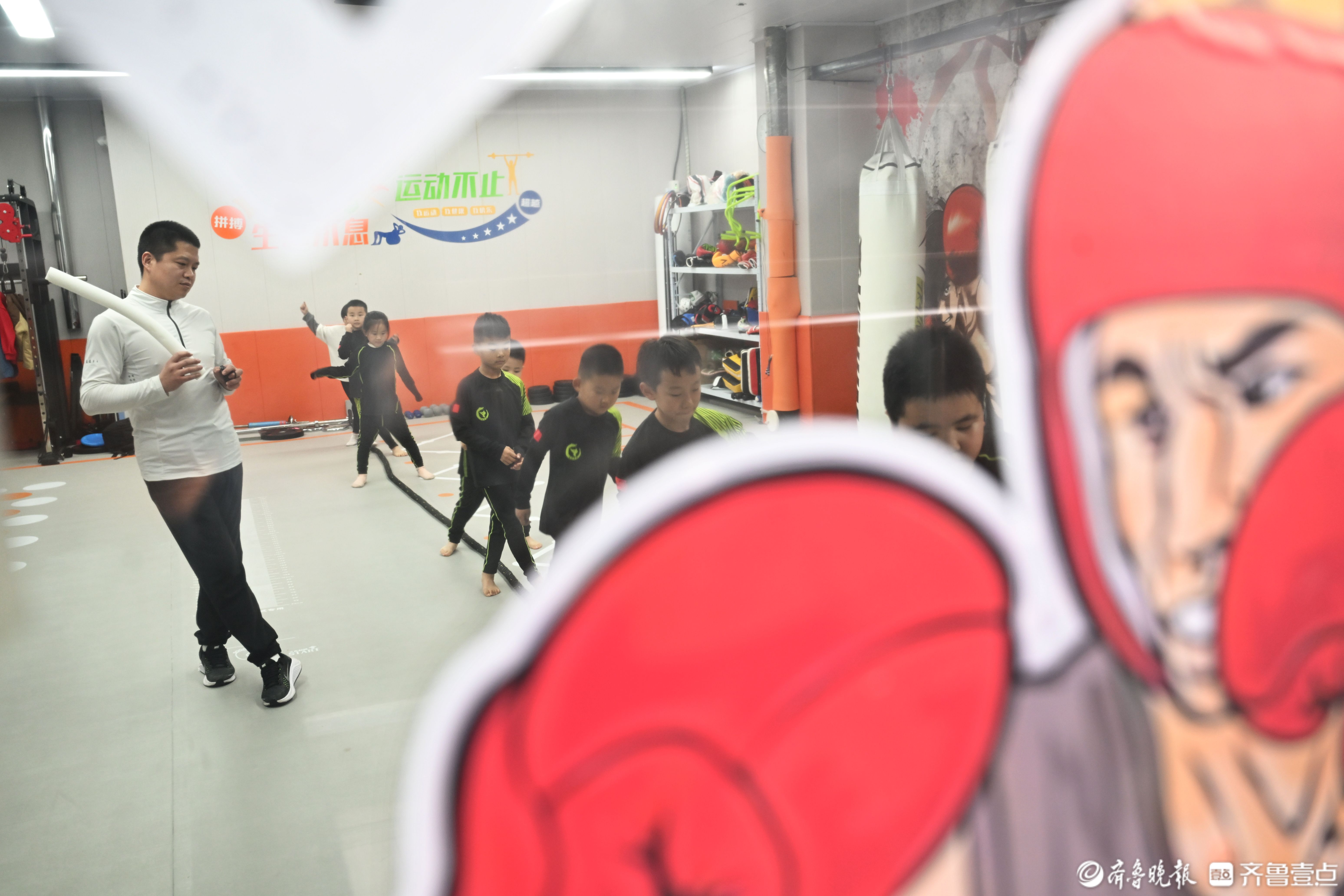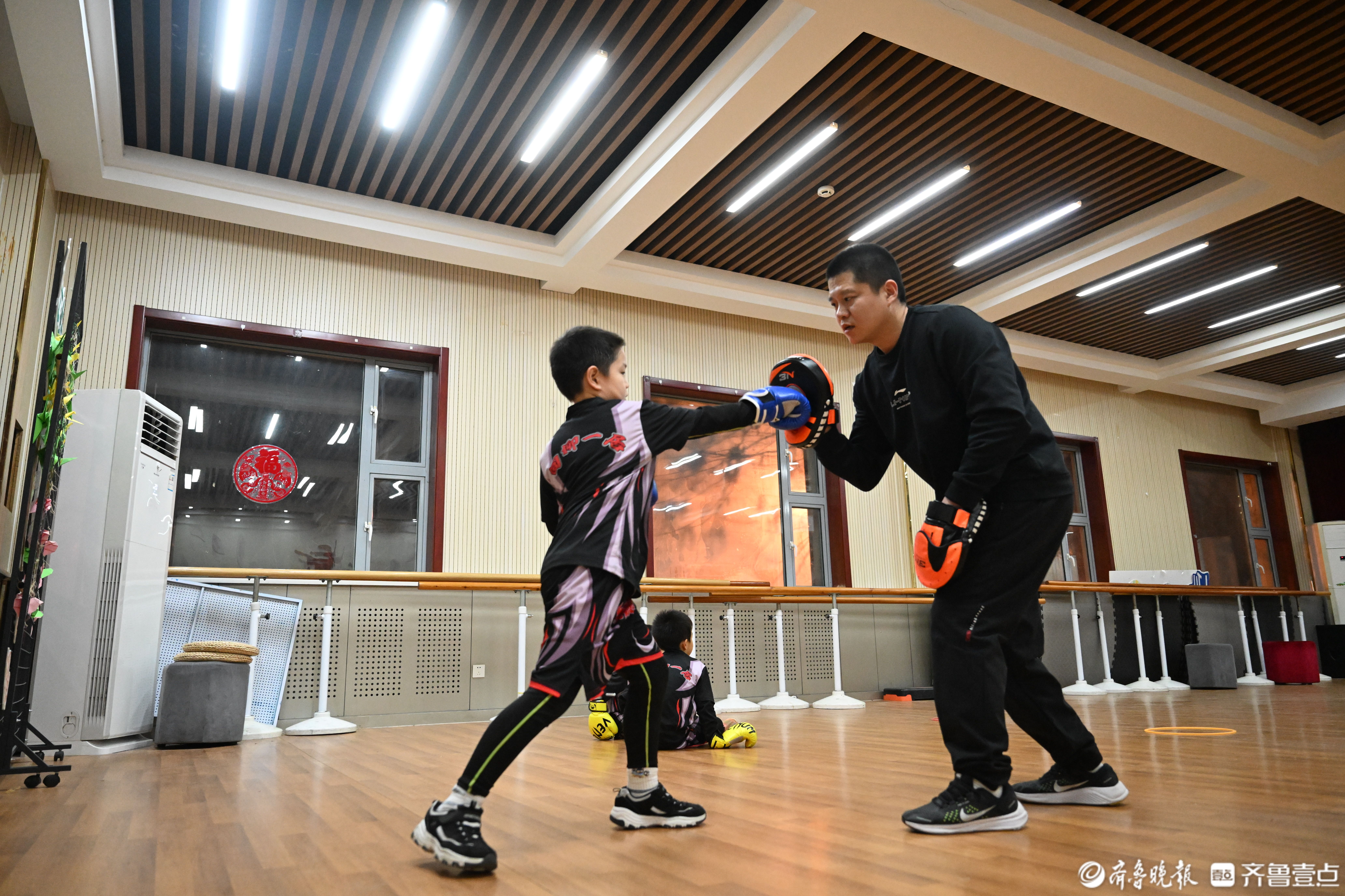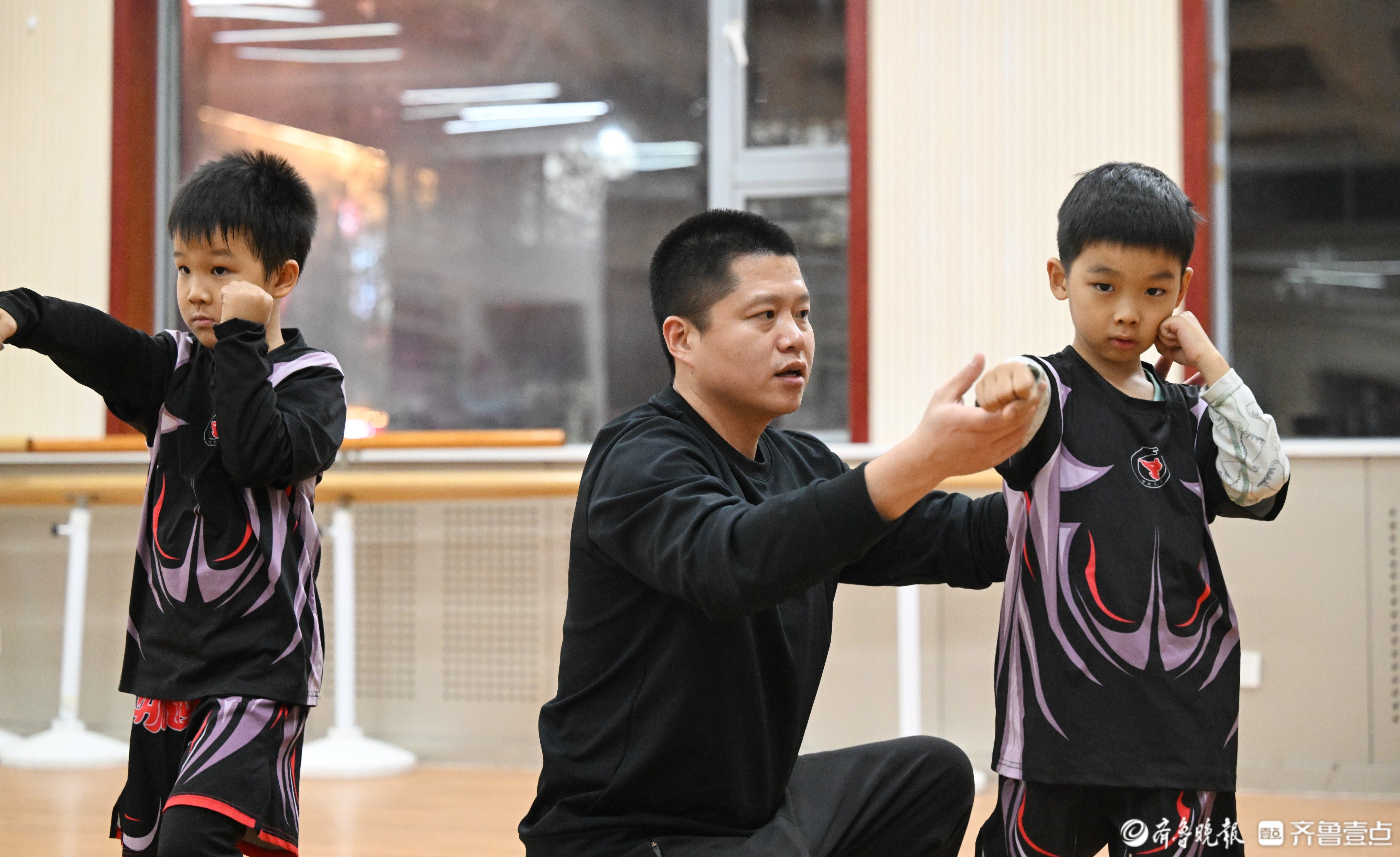 每逢周一、周四傍晚,济南甸柳第一社区活动中心二楼,就会传出“嗨嗨”的呐喊声和“嘭嘭”的击打声,一群孩子正跟随一位身形矫健的教练练习搏击基本功。这位教练就是社区散打搏击主理人吴志强,曾经的全国空手道亚军,如今孩子和家长口中的“吴教头”。