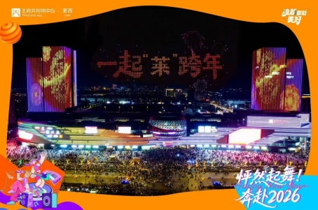王府井莱西购物广场以“怦然起舞 奔赴2026”为主题,推出千架无人机灯光秀、跨年音乐DJ派对、辣肌次元潮音派对等重磅跨年活动。极具科技感与氛围感的无人机灯光秀和人工造雪场景吸引大量市民聚集,活动当晚客流突破2万人次,成功打造了莱西跨年消费新地标。