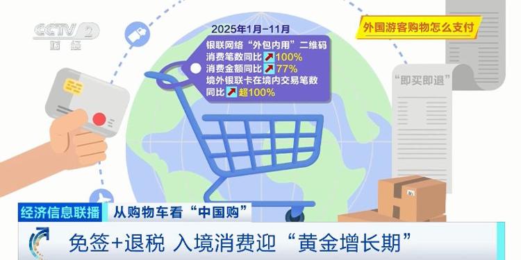 2025年1月至11月,银联网络“外包内用”二维码消费笔数和金额同比分别上涨100%、77%,境外银联卡在境内交易笔数同比增长超100%。