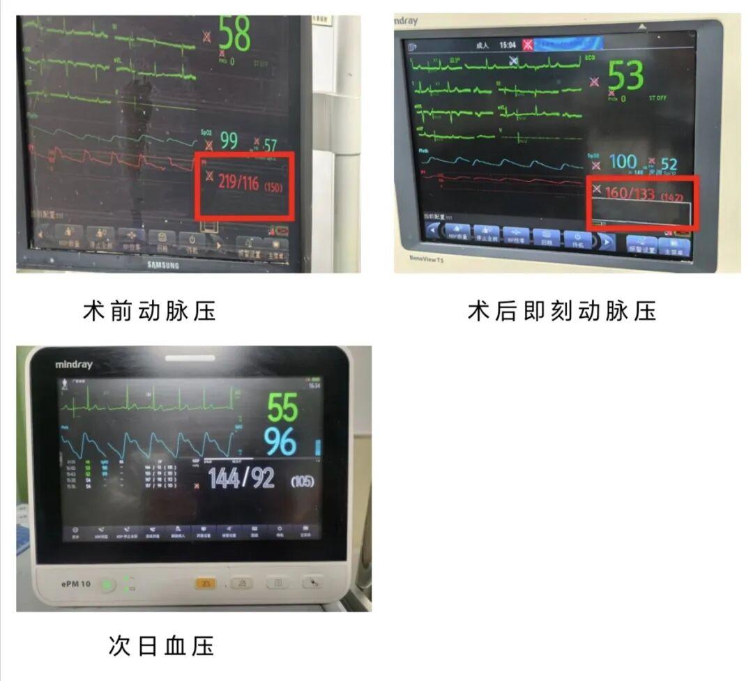 手术在导管室精密进行。于主任团队做了充分的术前准备,认真分析了患者双侧肾动脉及主要分支的结构特点,凭借精湛的技艺,通过患者大腿根部的一个微小穿刺点,将治疗导管精准送达肾动脉目标区域逐段进行消融。手术过程顺利,术前动脉压力219/116mmHg,术后即刻动脉压下降至160/133mmHg,手术次日,在二联用药下血压降至144/92mmHg,出院后还有望进一步减少降压药用量。