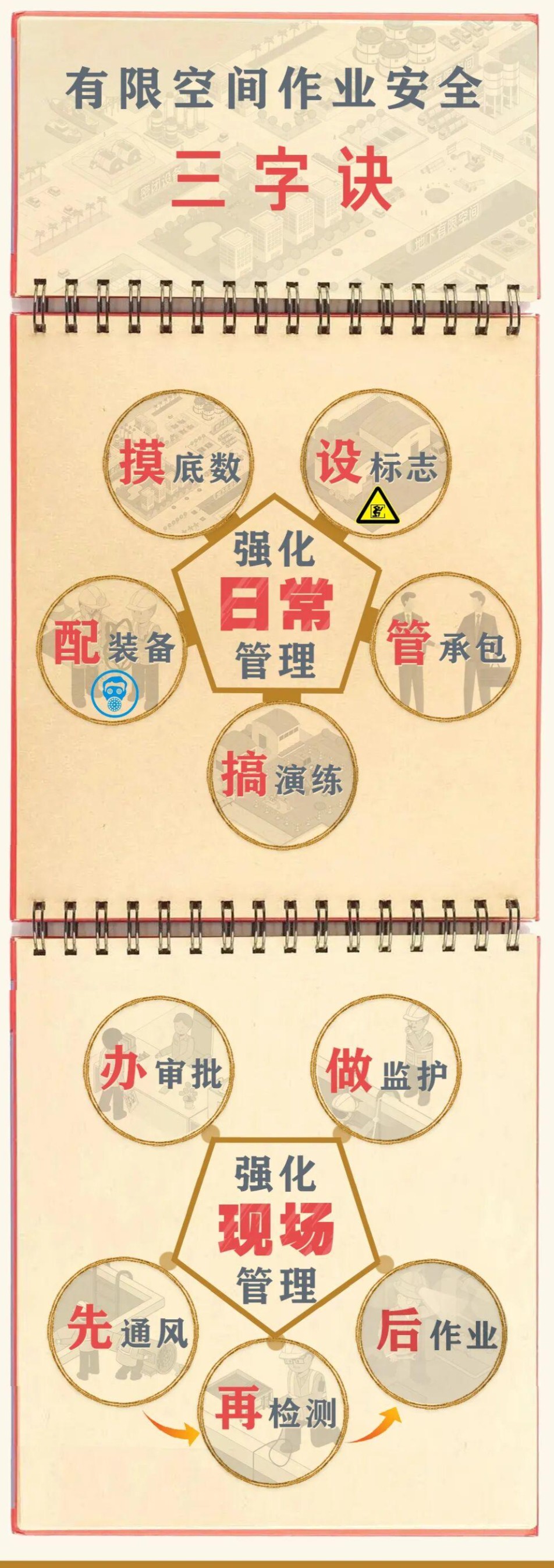 有限空间狭小、通风不畅不利于气体扩散看似“相貌平平”但却是隐形杀手有限空间作业安全如何保障?“三字诀”要牢记!↓↓↓