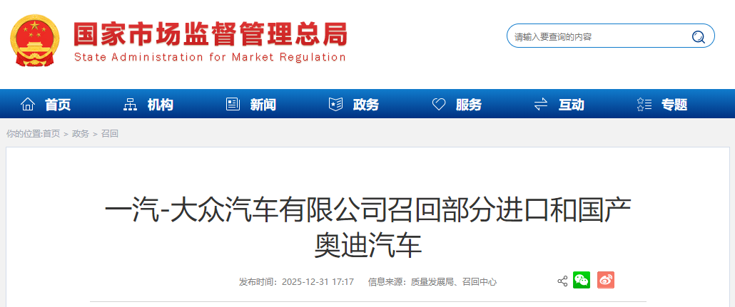 日前,一汽-大众汽车有限公司根据《缺陷汽车产品召回管理条例》和《缺陷汽车产品召回管理条例实施办法》的要求,向国家市场监督管理总局备案了召回计划。