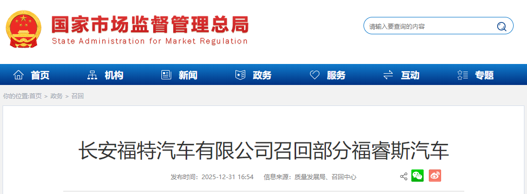 召回编号E2025M0202V:自即日起,召回2018年2月27日至2019年5月9日期间生产的部分福睿斯汽车,共计38473辆。