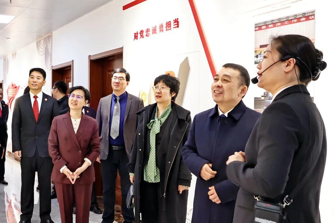 仪式前,王效彤一行调研了渤海先进技术研究院、市法智护航中心、滨州知识产权司法协同中心、滨州中院诉讼服务中心、滨法书苑和红色503党建文化长廊,详细了解滨州法院服务发展、自身建设等工作情况。这是红色503党建文化长廊提档升级后的首次亮相,长廊立足“一面旗、一座桥、一颗心、一把尺、一张网、一盏灯”“六个一”党建业务融合发展体系,集中展示滨州中院坚定不移抓党建带队建促审判的工作情况。