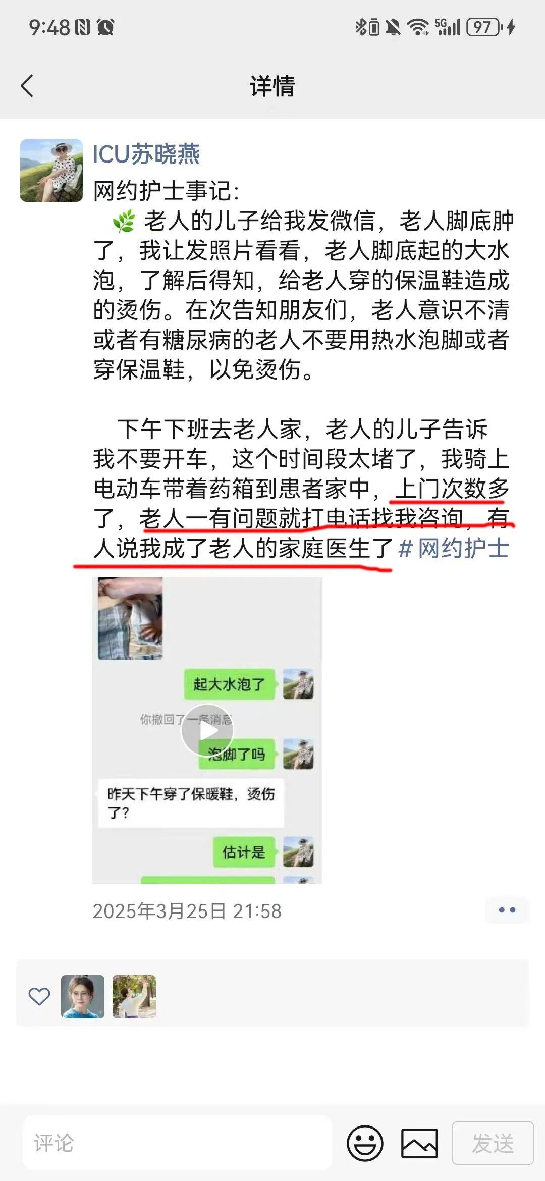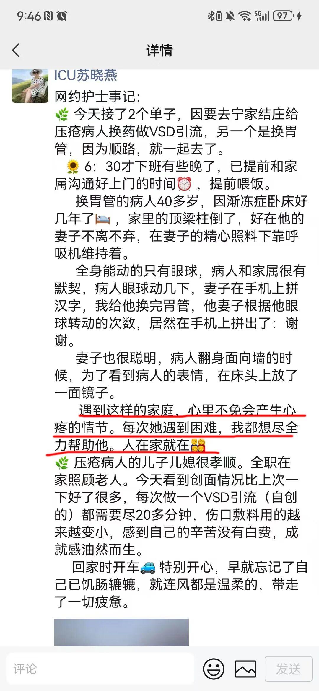 翻开苏晓燕的微信朋友圈,一段段文字、一段段视频,能看到她把上门护理服务当成日常生活来记录。她会因为老人长时间卧床导致伤口持续不愈合而着急,当即给老人的儿子打电话让他常回家帮助老人翻身;会因为患者太年轻就瘫痪在床而心疼他的妻子,想尽全力帮忙,她说人在家就在;会因为小患者等待她上门吸痰没有吃饭而内疚,心疼他小小年纪就承受病痛的折磨。网络上有一种声音,说作为医生和患者共情是大忌。但是苏晓燕却说:“如果连我们医护都冷漠了,那患者还能指望谁来温暖?我不是在共情,我是在尽心。作为一名护士,一名党员,我不能眼睁睁看着他们受苦,却告诉自己‘这不关我的事’。”