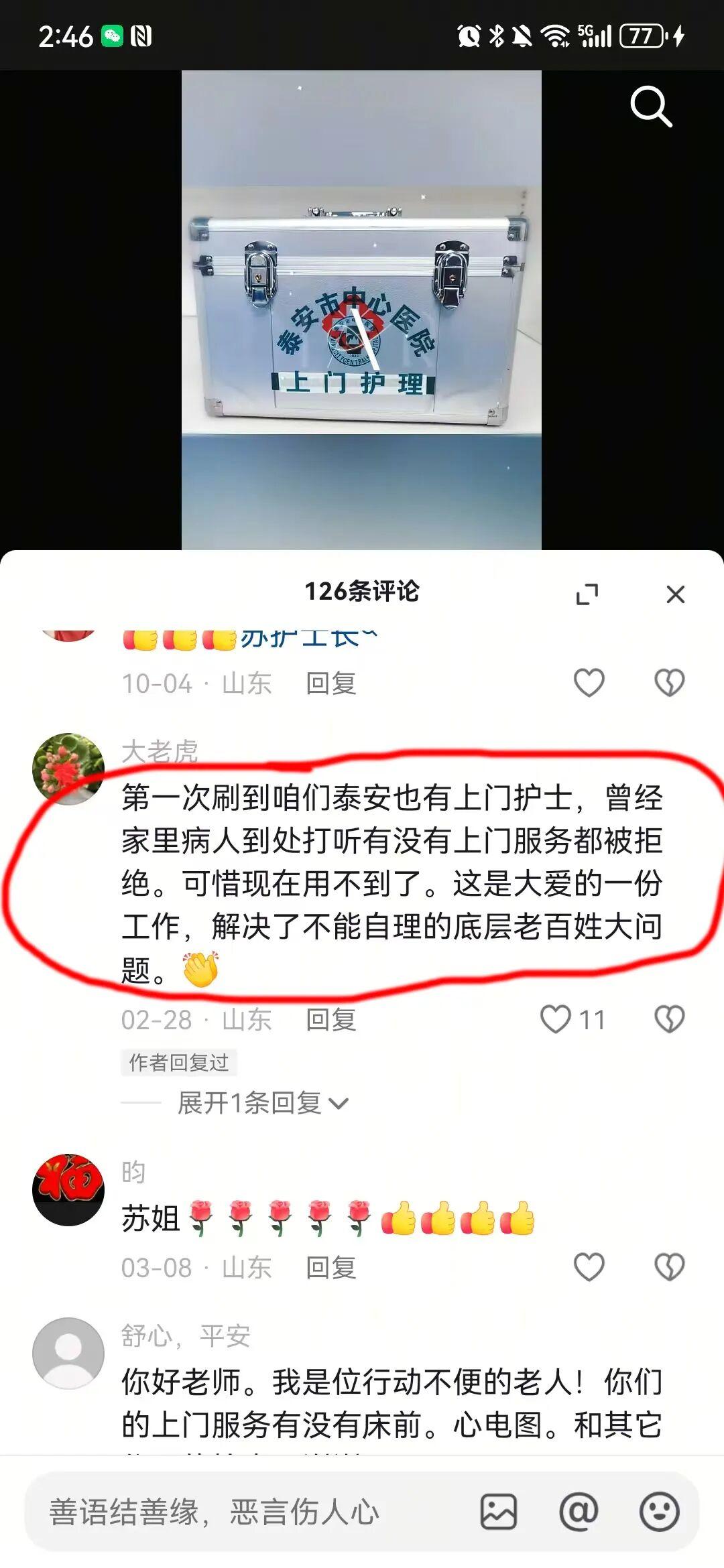 有一次,一位长期卧床的老人尿管脱出,已一天一夜未排尿,家人焦急万分。由于此前曾尝试过其他医院的上门护理未果,这次他们直接联系了泰安市中心医院。到达现场后,苏晓燕迅速评估病情,成功为老人重新置管并导出满满一袋尿液。当尿液流出的瞬间,老人的脸上也已泪流满面。苏晓燕说:“看到阿姨流泪的时候,我的心里也在跟着流泪。自己儿女不在身边,家里人连水都不敢给老人喝,整整一天一夜啊,可想而知老人有多难受,他们只能靠我们这些医护人员。”