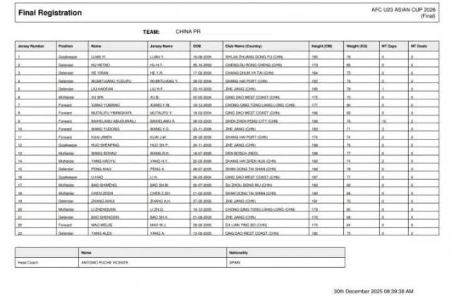 北京时间1月4日,U23亚洲杯中国队大名单公布:王钰栋领衔,胡荷韬、拜合拉木、蒯纪闻在列。相较之前的29人名单,朱鹏宇、依木兰、李新翔、张一轩、吴启鹏、姚浩洋落选。