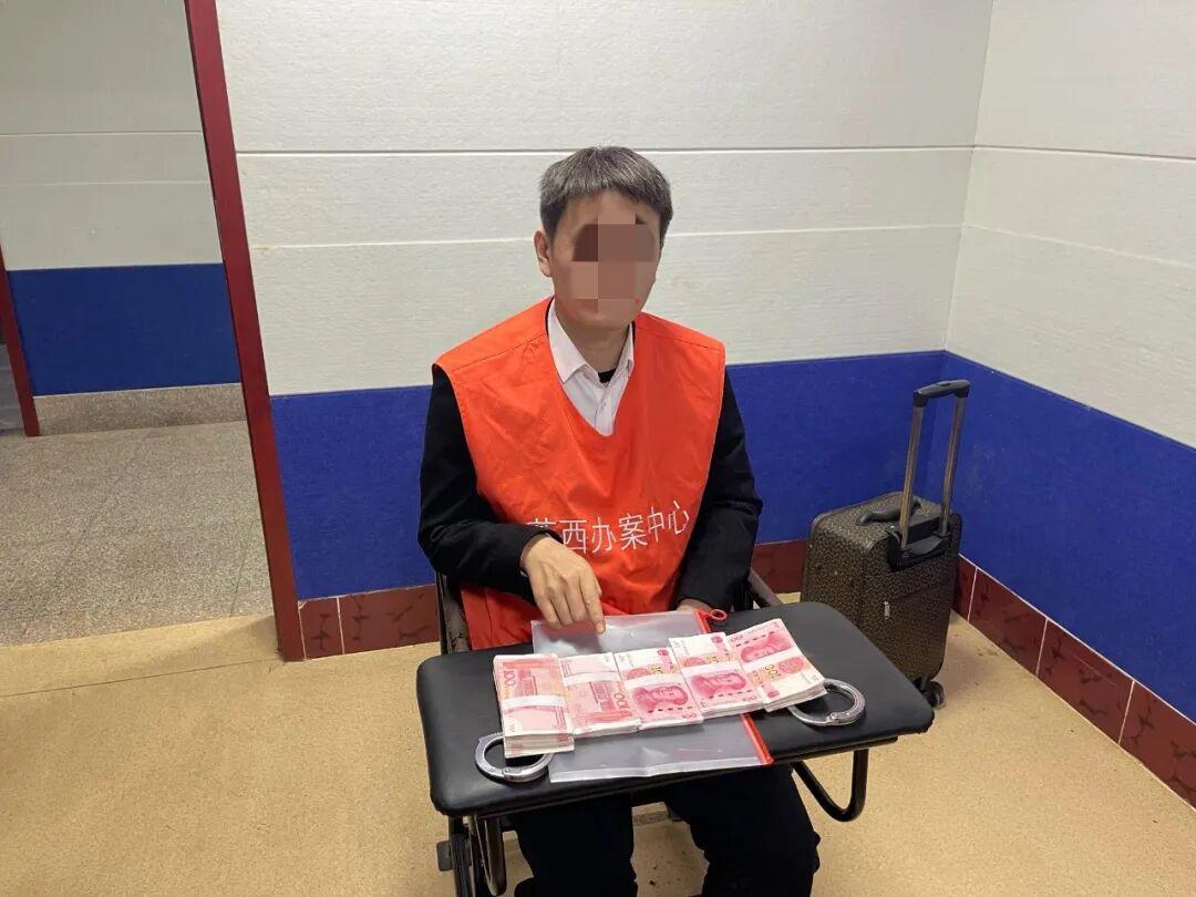 24日10时许,布控民警发现有一名戴口罩的年轻男子乘坐出租车到达收费站,体貌特征与警方掌握的诈骗嫌疑人特征极其吻合,并且男子在出租车离开后一直原地徘徊,嫌疑极大,民警遂对其重点监控。大约30分钟后,一名骑电动车的男子赶到戴口罩男子面前,并将一摞现金交给对方进行清点,见时机成熟,民警立即冲上前将嫌疑男子查获。