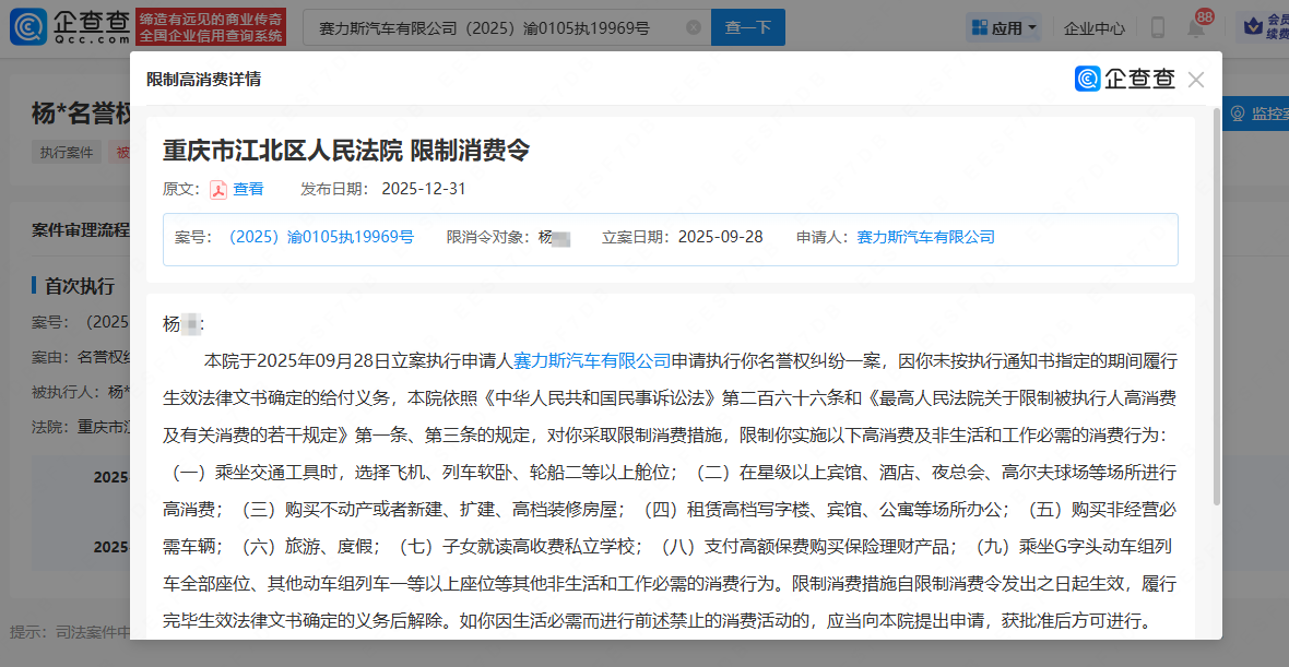 企查查APP显示,近日,赛力斯汽车有限公司起诉杨某一案更新,因被告杨某未按期履行生效法律文书确定的给付义务,法院对其采取限制消费措施。案件流程显示,此前杨某因此案被执行34129元。据悉,涉案账号为“老朱真的喜欢车”,法院判决其公开道歉并赔偿损失。(企查查)