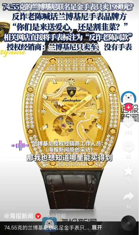 反诈老陈喊话兰博基尼手表:标注999纯金,是不是有虚假成分?授权经销商回复