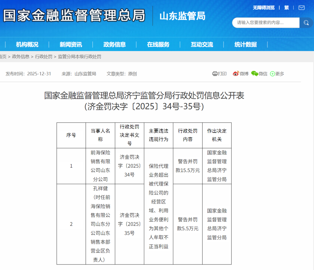 2025年12月31日,国家金融监督管理总局山东监管局公布多个处罚信息,涉及前海保险销售有限公司(下称“前海保险销售公司”)枣庄分公司和前海保险销售公司山东分公司。