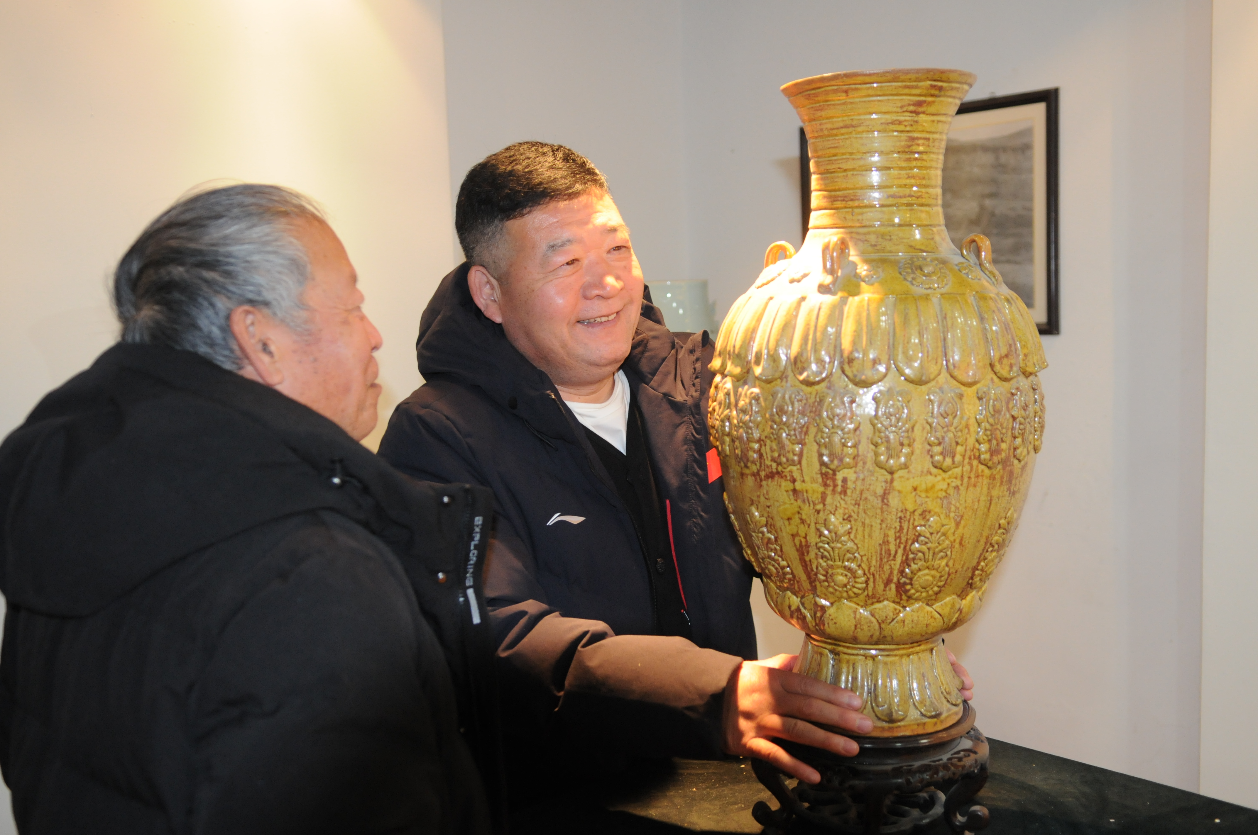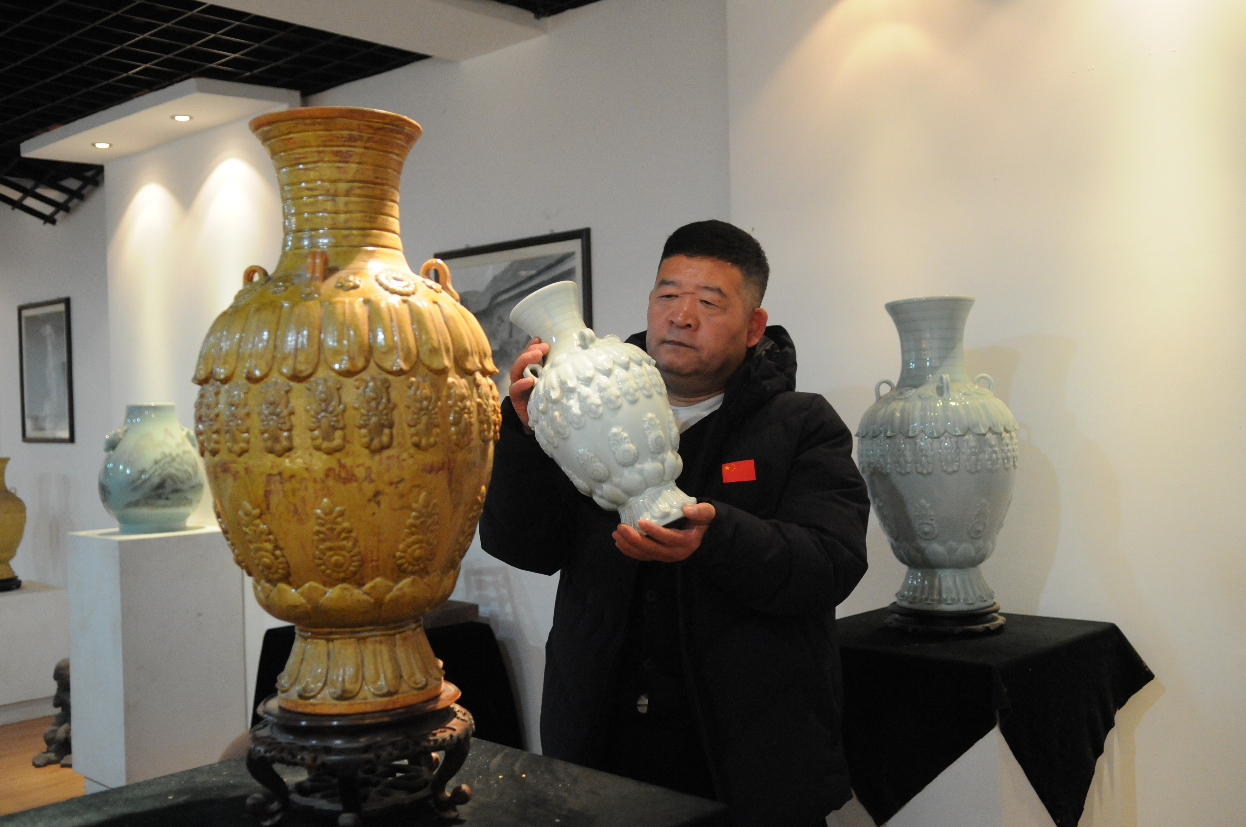 国家一级文物青瓷莲花尊,是南北朝时期青瓷工艺成熟的标志性器物。其造型优美,装饰典雅,全身施青釉,釉薄而均匀,釉色青中泛黄,光亮莹润,华贵之气盎然,是当时不可多得的高贵礼器。齐鲁文化之星、山东省淄博辰浩陶瓷艺术研究设计院院长,出身于陶瓷世家的牛继伟经过多年探索,终于还原烧制出青瓷莲花尊,并设计生产了16种大小不一的系列,使这一盛世礼器走入寻常百姓家。