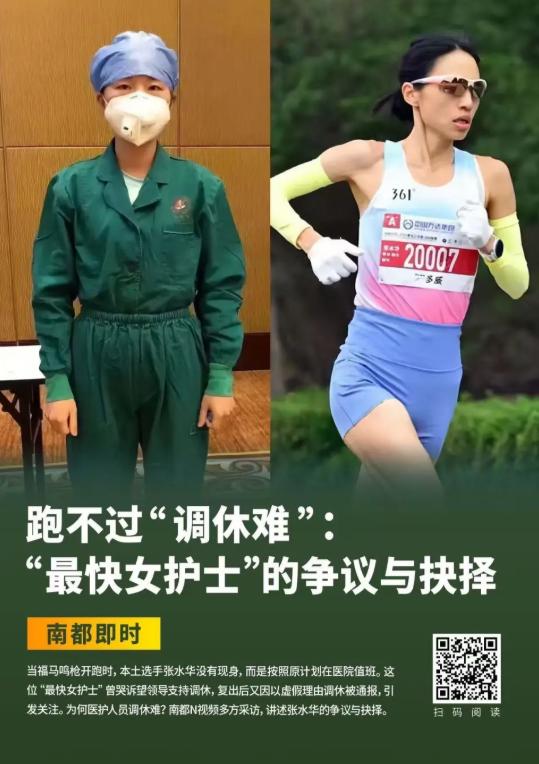 南都此前报道,张水华在哈尔滨马拉松比赛获国内女子组冠军,赛后哭诉“望领导支持调休跑马拉松”,持续引发关注。2025年12月10日,福建医科大学附属第一医院通报,依规依纪对“最快女护士”张水华违规兼职取酬、以虚假理由获取调休问题进行处理。2025年12月11日,有消息称,张水华已从该院离职。福建医科大学附属第一医院院长康德智告诉记者,“没这回事,她在正常上班。”