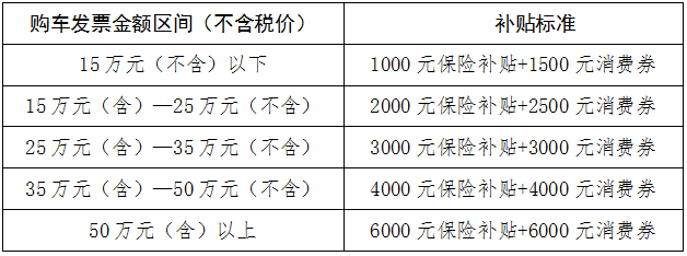补贴资金发放遵循“先到先得”原则,5000万元补贴额度将分批次释放,具体释放时间为1月23日10时、2月27日10时、4月3日10时,按申报人提交资料的先后顺序申领,额度用完或活动时间截止,活动即终止。补贴标准参照《机动车销售统一发票》所载不含税价(不含车辆装潢、挂牌等其他费用)执行。具体如下: