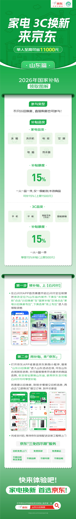 近日,2026年国家以旧换新补贴落地山东,京东线上线下全面承接国家补贴落地。山东消费者到京东APP搜索“山东以旧换新”即可进入国补页面,享国补购心仪好物。上京东,消费者购买活动指定的冰箱、洗衣机、电视、空调、电脑、热水器产品,单件/单次至高补贴1500元;购买活动指定的手机、平板、智能手表手环、智能眼镜产品,单件/单次至高补贴500元。单人累计至高可省11000元!此外,京东也带来海量爆款好物,1月1日起,上京东领国补,买手机、电脑、家电等好物低至五折!