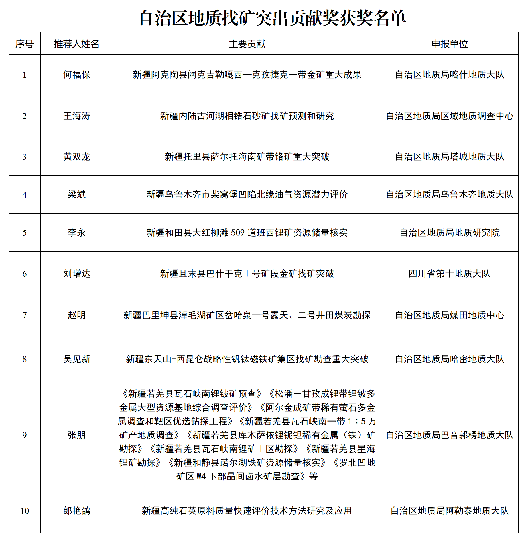 自治区地质找矿突出贡献奖的有10人,他们分别是何福保、王海涛、黄双龙、梁斌、李永、刘增达、赵明、吴见新、张朋、郎艳鸽。