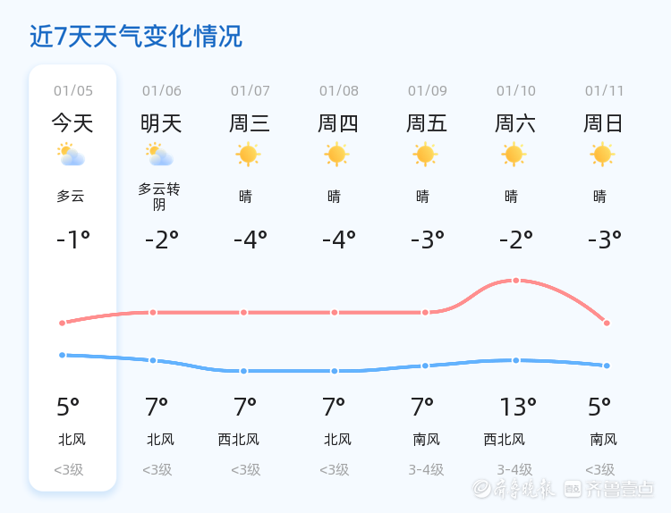 预计明天(1月6日)济宁市天气仍为多云转阴,气温范围在-2℃至7℃之间,与今日相比,最高气温有所上升,最低气温略有下降。市民需关注气温变化,适时增减衣物。