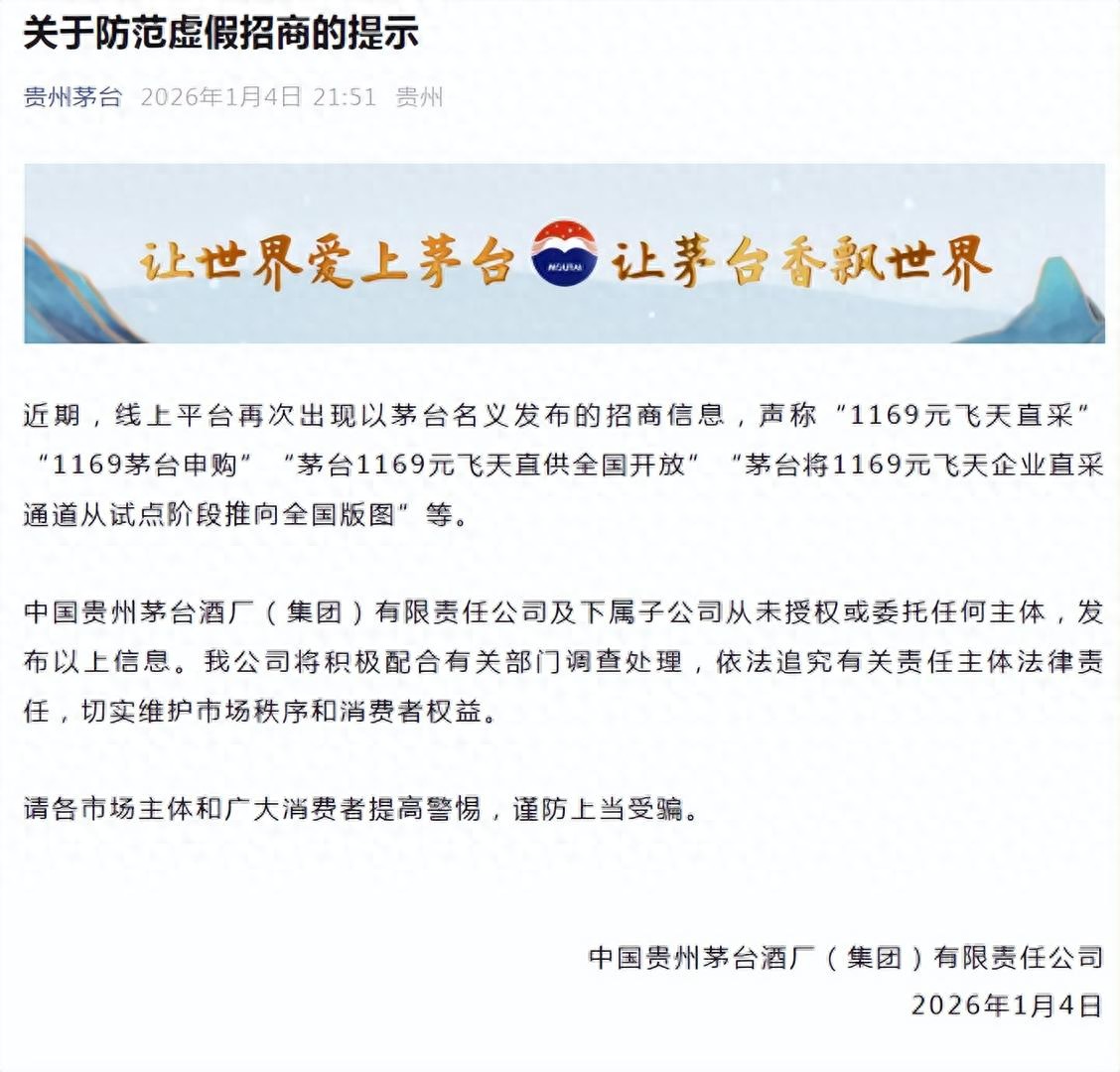 茅台辟谣“1169元飞天直供全国开放”:防范虚假招商