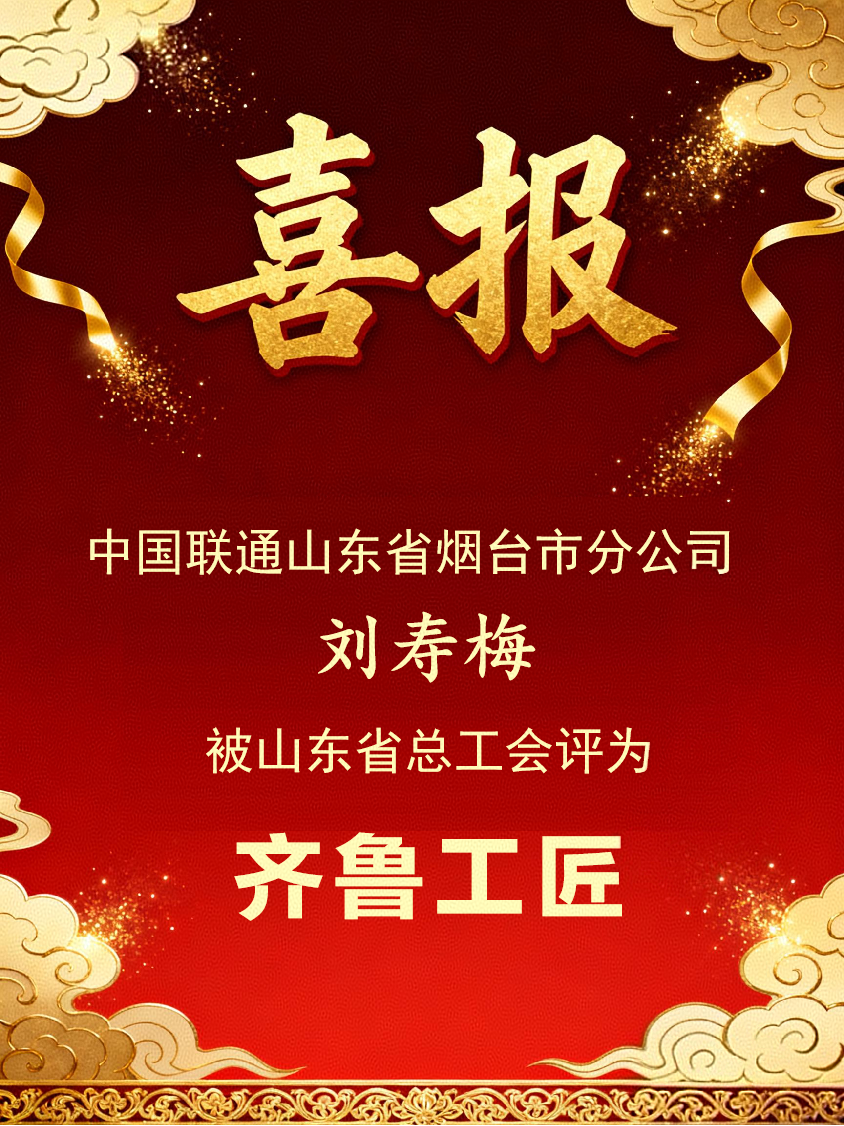 近日,山东省总工会下发了《关于公布2025年鲁班首席工匠 齐鲁大工匠 齐鲁工匠 山东手造大工匠 山东手造工匠的通知》,烟台联通技术总监刘寿梅荣获第八届“齐鲁工匠”荣誉称号。