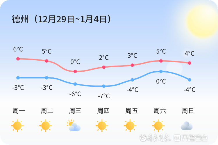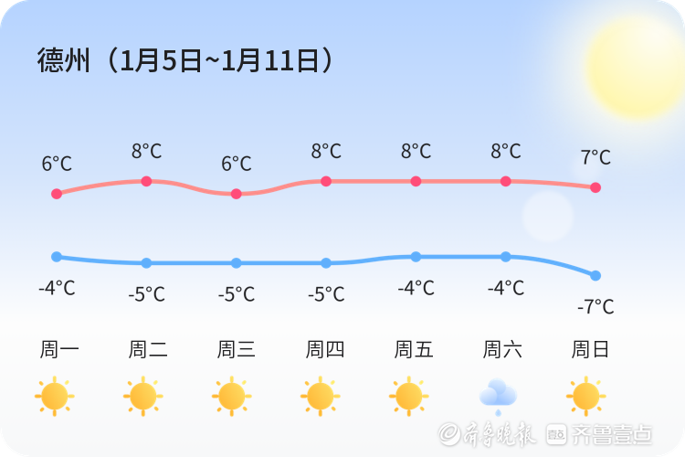 全市周平均最高温7℃,平均最低温-4℃,平均气温1℃,周最高气温8℃,出现在周二、周四、周五、周六,周最低温-7℃,出现在周日。