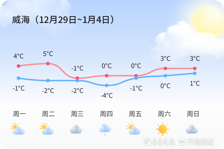全市周平均最高温3℃,平均最低温-1℃,平均气温1℃,周最高气温6℃,出现在周二,周最低温-5℃,出现在周日。