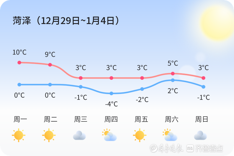 全市周平均最高温9℃,平均最低温-1℃,平均气温3℃,周最高气温12℃,出现在周日,周最低温-4℃,出现在周日。