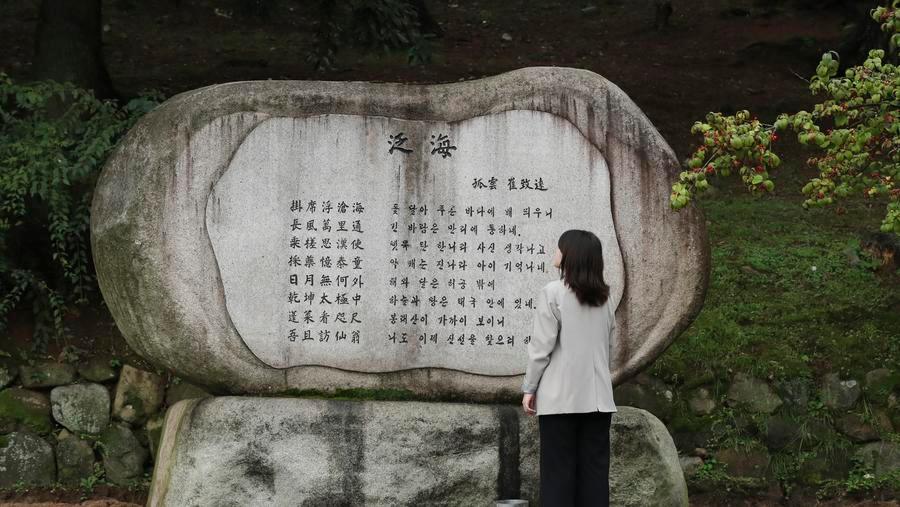 2025년 10월 16일 경주 상서장 앞에서 최치원의 대표작 '범해'를 감상하는 관광객. (사진/신화통신)