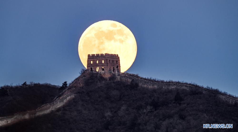 3일 베이징(北京)시 미윈(密雲)구 구베이커우(古北口)진 판룽산(蟠龙山) 장성에 떠오른 슈퍼문.