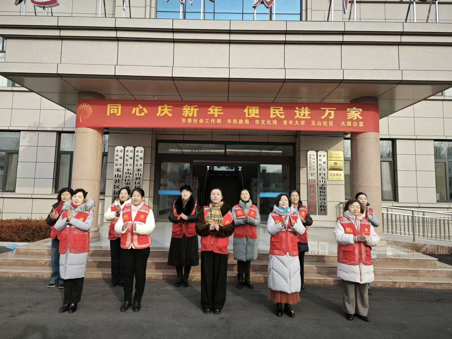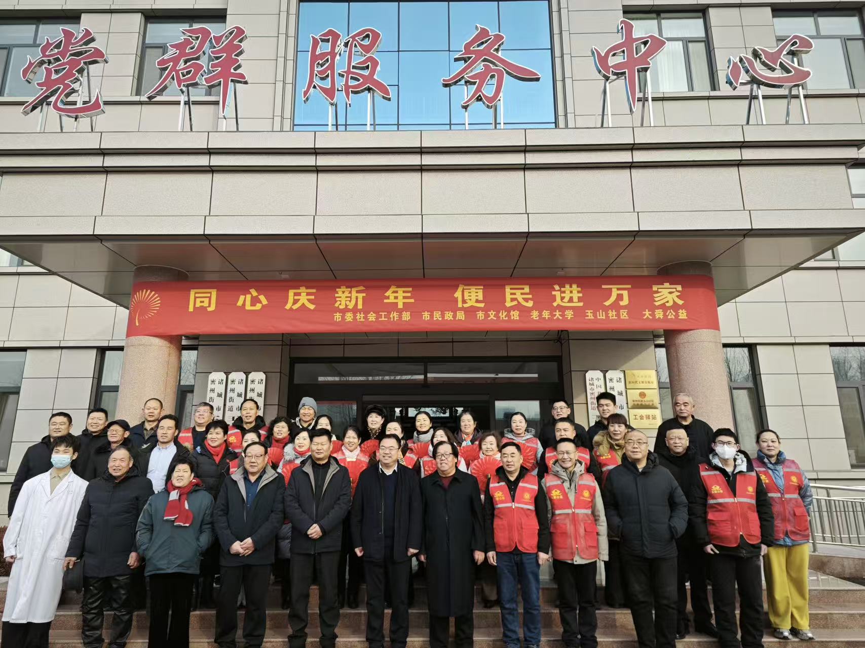 2026年1月4日上午,诸城市密州街道玉山社区党群服务中心广场暖意融融、欢声汇聚,“同心庆新年、便民进万家”公益活动在此温情启幕。本次活动在市委组织部、市委社会工作部、市民政局的悉心指导下,由玉山社区与大舜公益联合主办,诸城市非遗协会、老年大学等多家单位鼎力参与,各界爱心人士与社区居民欢聚一堂,共庆元旦佳节,共赴便民之约,共话美好新生活。