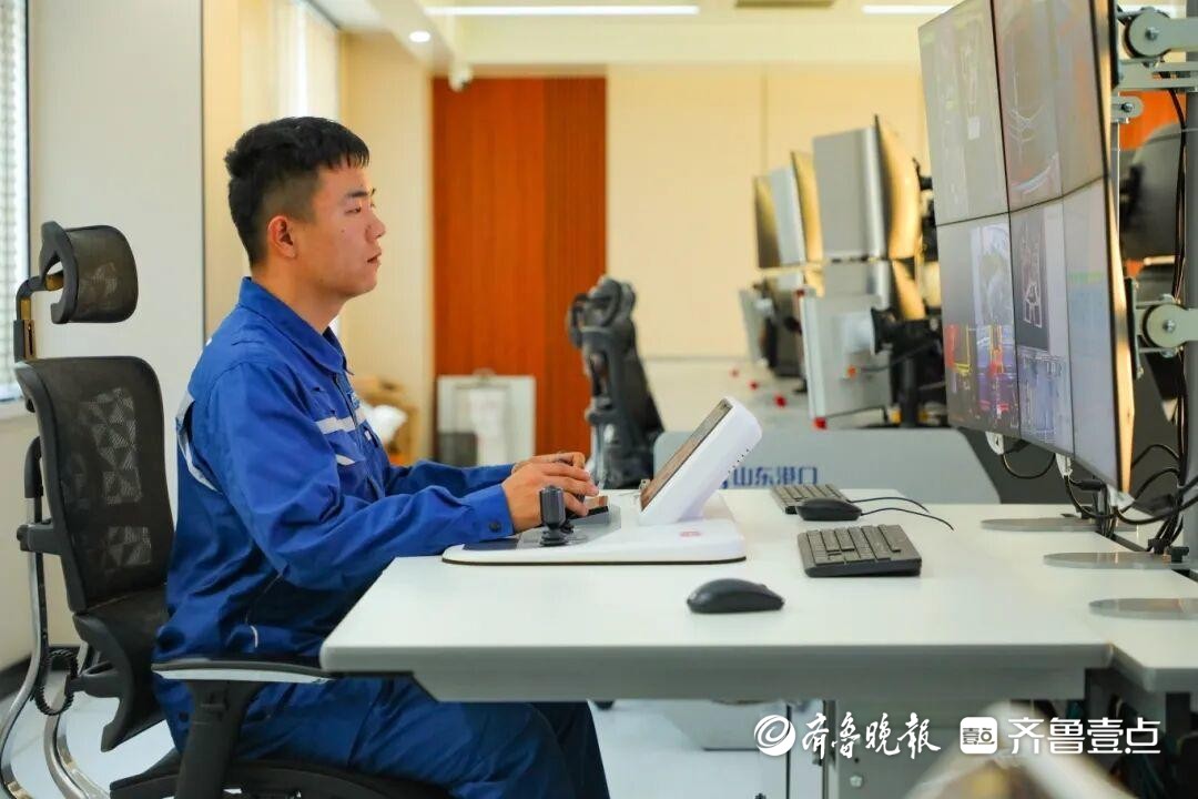 在日照港石臼港区南区智能运营中心集控室,一公司卸船机司机刘国靖高度专注,实时监控系统自动生成的抓取路径,综合船型、舱内物料分布及潮汐风力等因素,动态调整作业参数。他紧盯设备反馈数据,预判潜在风险,一旦系统识别异常,立即介入,凭借经验手动优化操作序列,全力保障卸船作业安全高效。