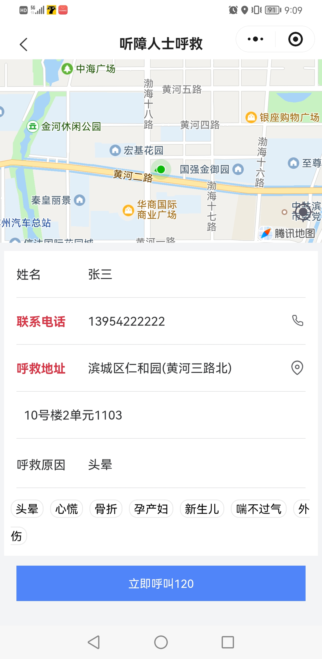 输入联系电话、呼救地址等信息,点击“立即呼叫120”。